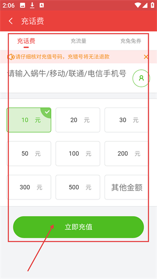 2、进入充话费页后,输入手机号并选充值金额,点击【立即充值】就能完成话费充值哦。