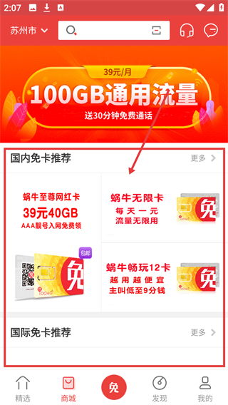 3、在商城页面,可查看【国内免卡推荐】里的套餐,选心仪的免卡就能进入详情页啦。