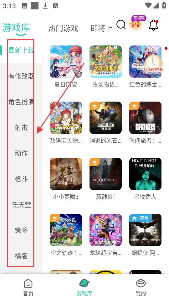2、进入游戏库页面后,可看到左侧有最新上线、角色扮演等多个游戏分类,选择感兴趣的分类哦。