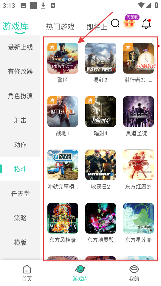 1、在软件首页,点击【游戏库】,可进入游戏库页面,查看各类游戏分类啦。