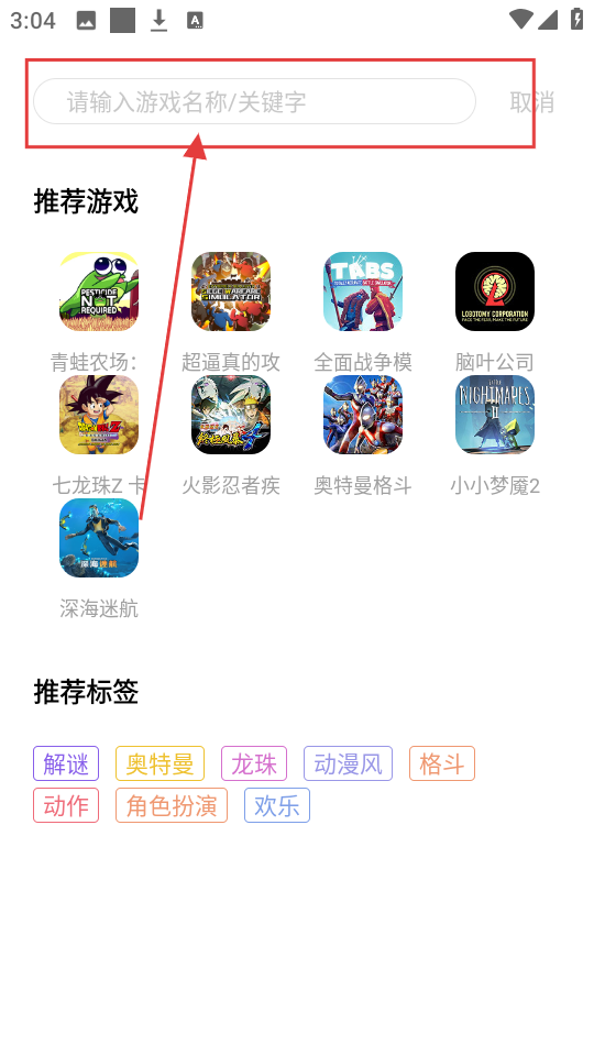 2、进入搜索界面后,在搜索框输入游戏名称或关键字,就能快速找到相关游戏,超方便的哦。