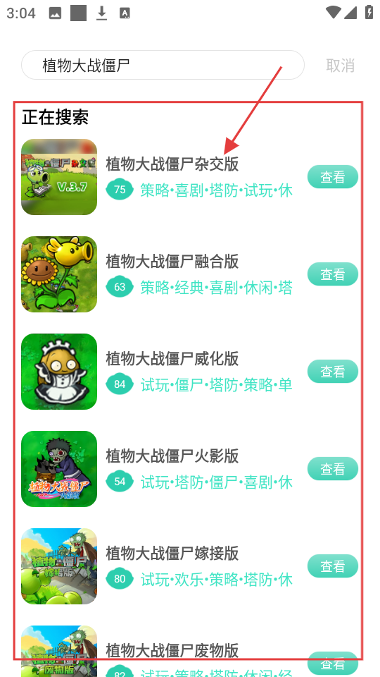 3、搜索“植物大战僵尸”后,会出现【杂交版】【融合版】等多个版本,选择你感兴趣的版本查看吧。