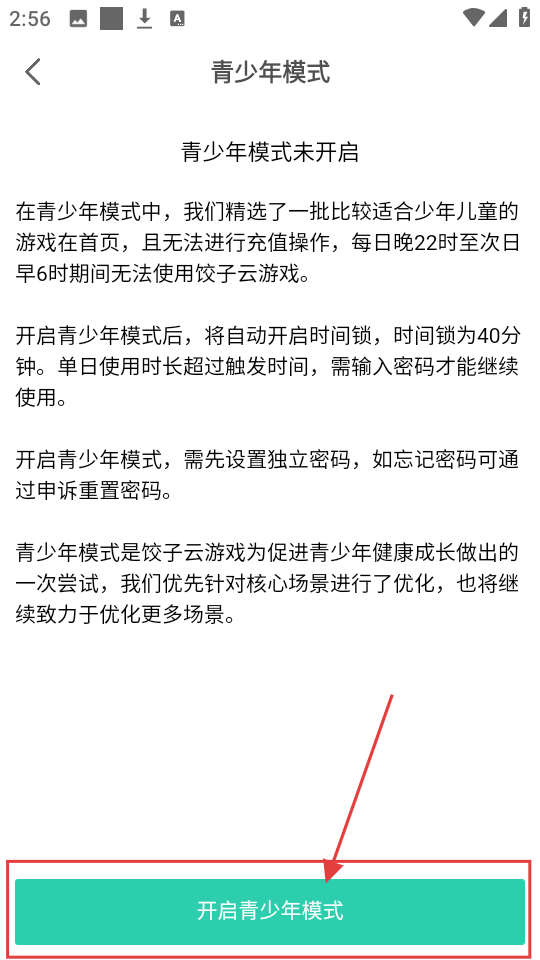 3、进入【青少年模式】页面后,点【开启青少年模式】,就能设置青少年模式啦。