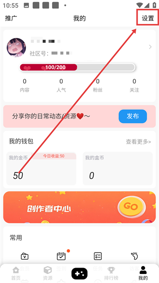 2、进入个人中心后,点右上角的【设置】,能进入资料设置界面,调整账号资料啦。