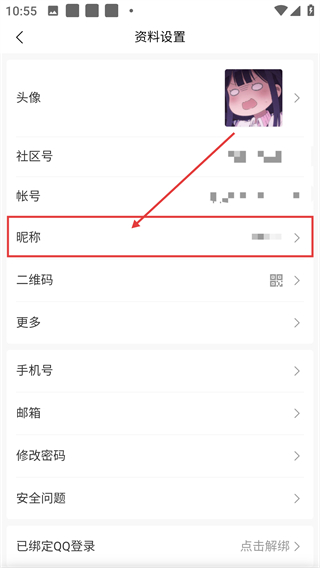 3、在资料设置页,点【昵称】选项,可进入昵称修改界面,更换账号的显示名称呢。