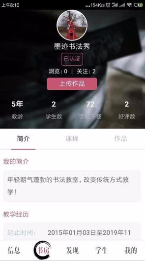 3、添加自己的履历,让教学经验丰富,给学生专业的书法教学,学生学习更放心。