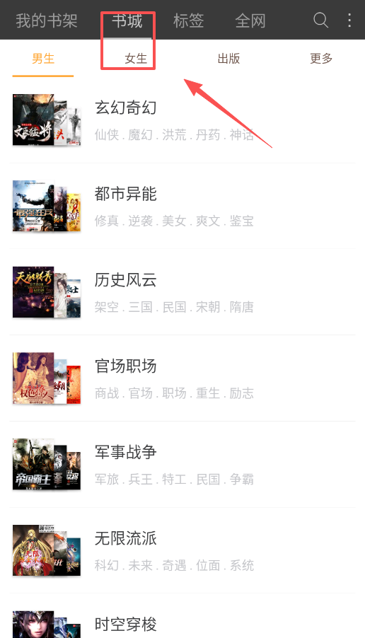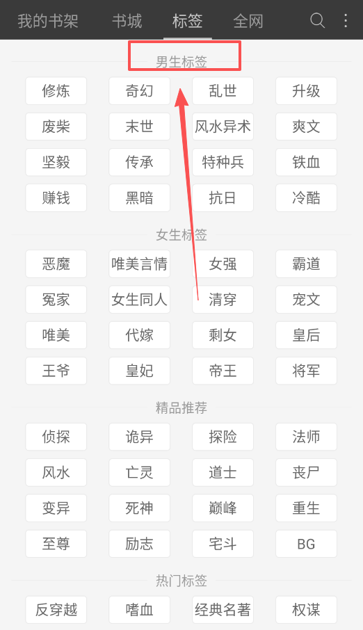 2、标签系统很有特色,分男生、女生、精品、热门四块,像“风水异术”“亡灵”“权谋”这类小众标签也能直接找到对应作品。