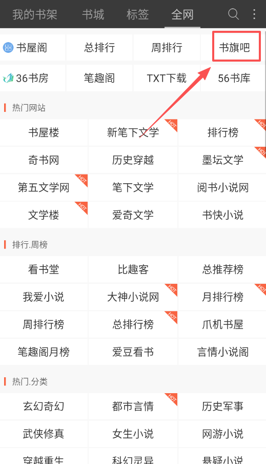3、全网页面其实是个资源导航,收录了书屋阁、书旗吧等网站,还有玄幻、都市等热门分类直达,相当于把浏览器书签整合进了App。