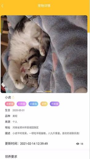 3、查看宠物详情,对宠物有全面的了解,便于和用户联系,让领养变得更便捷,提高宠物领养的质量体验。