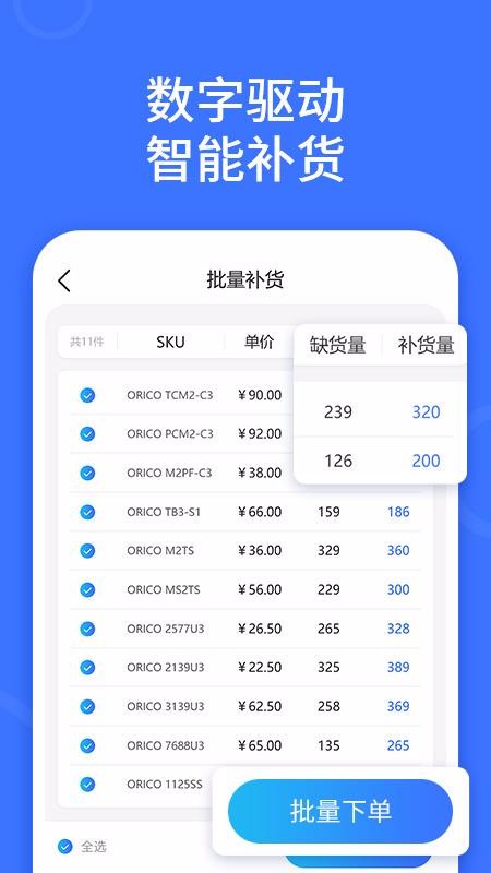 1、一键批量补货,让补货变得更专业,提高补货的准确度,提高商品管理的效率,给你更好的营销体验。