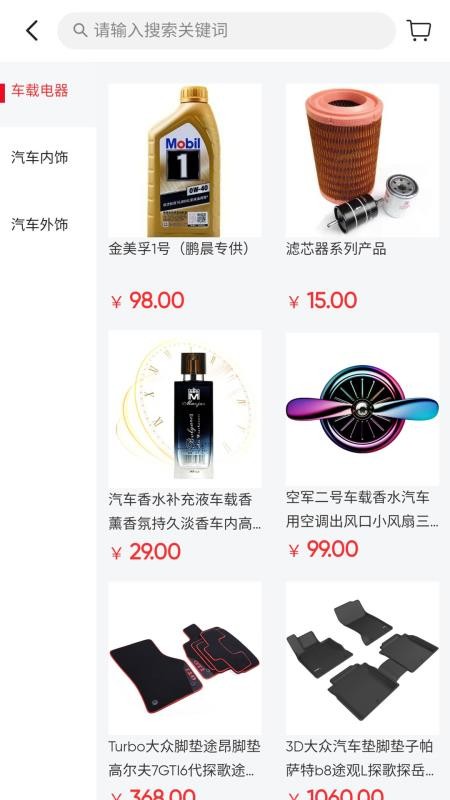 《鹏程养车》是一款汽车用品商城,展示有非常多的汽车用品,有车载电器、汽车内饰和汽车外饰等,轻松了解不同类型产品详细的信息,掌握不同类型产品的情况,按照自己的需求,在线下单支付费用购买,车主可以轻松快捷的购买到你所需要的商品,海量高品质的商品随时挑选购买,为车主提供高效轻松的服务。