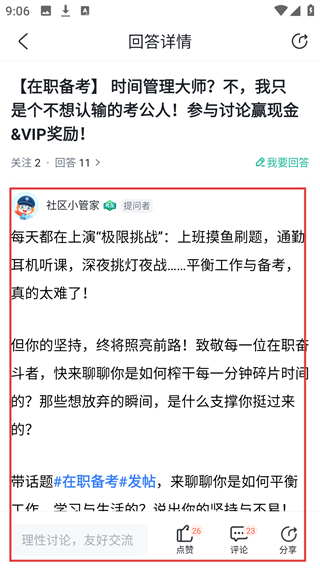 4、进入帖子详情页后,可查看完整内容,还能带话题#在职备考#发帖,分享自己的备考经验赢奖励哦。