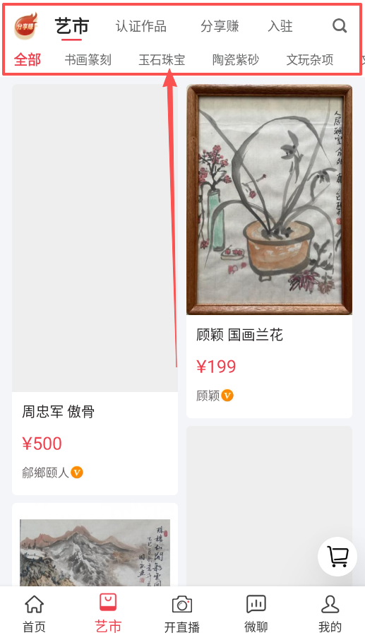 3、进入“艺市”板块,这里就像个艺术小市场,你可以按类别浏览全部作品,比如书画篆刻、玉石珠宝等。