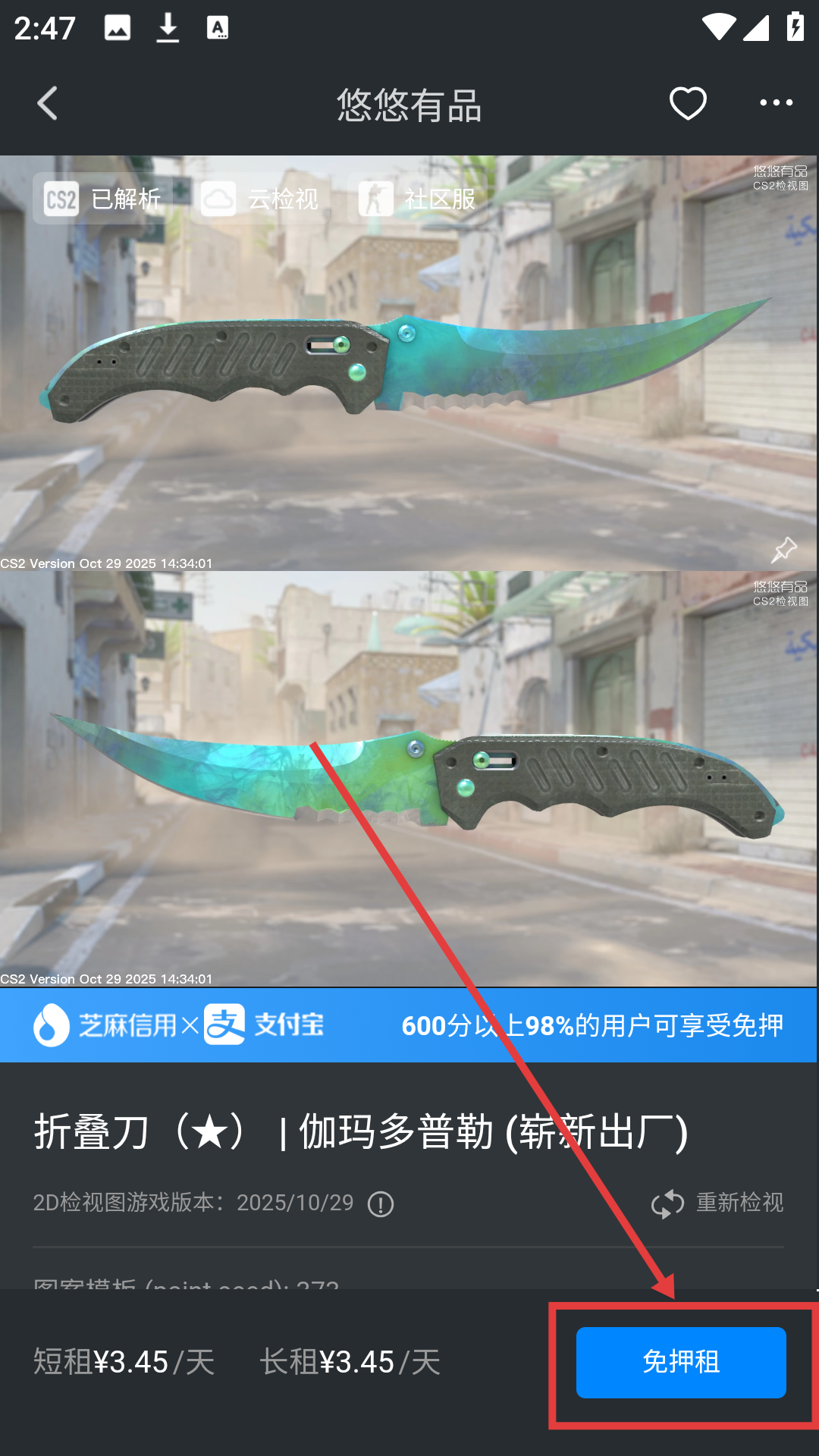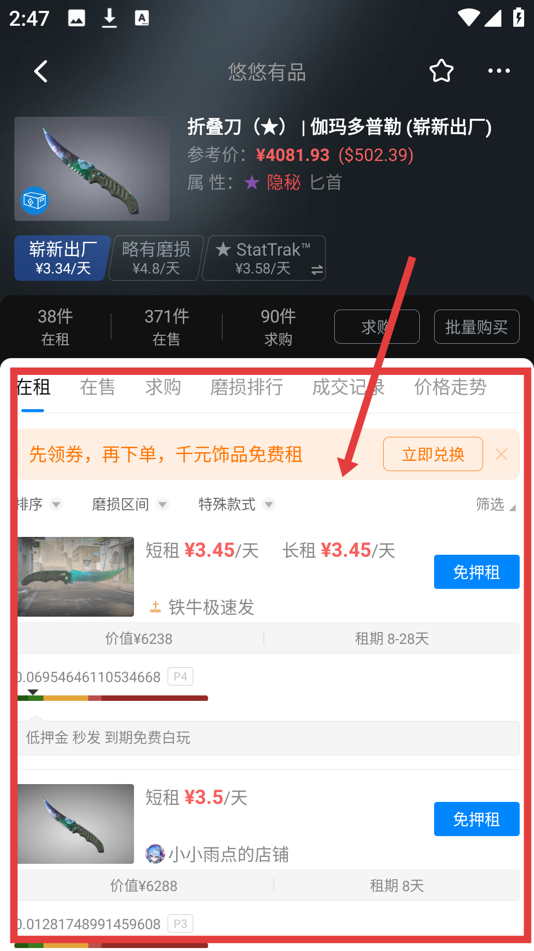 1、在租饰品界面选感兴趣的饰品,像【折叠刀伽玛多普勒】,点击进入饰品详情界面哦。