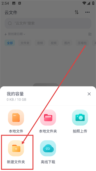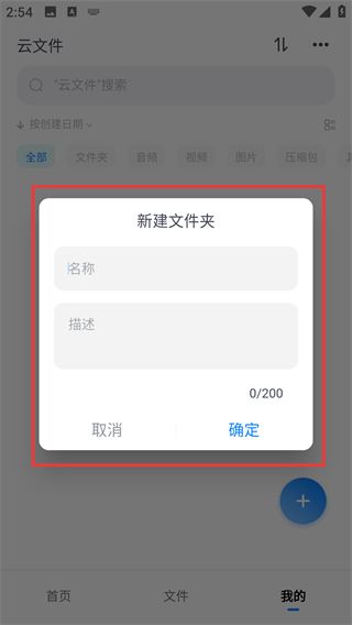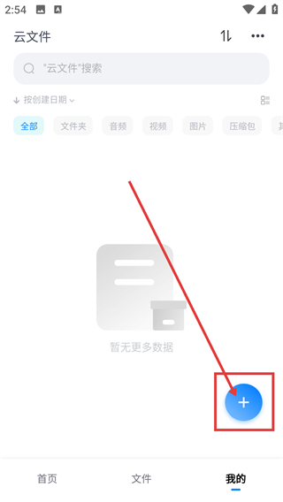 2、进入云文件页面后点击右下角的【+】按钮,就能展开操作菜单,选择要执行的文件操作哦。