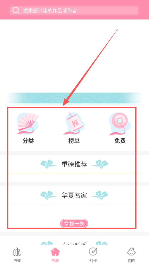 2、想找书的话就进入书城页面,顶部有搜索框可以直接输入作品或作者名,也可以通过分类、榜单和免费等标签筛选。