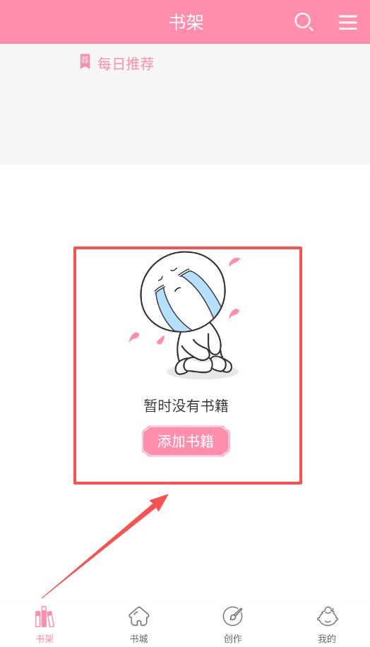 3、书架页面会显示每日推荐,如果暂时没有书籍可以点击添加书籍来填充,这里集中管理你的阅读记录,方便随时继续阅读。