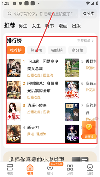1、在APP的书城推荐页,选择排行榜里的目标小说(如【下山后,闪婚高冷美女总裁】),点击进入该小说的阅读界面啦。