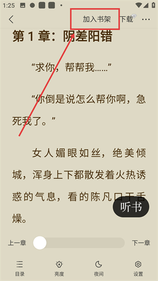 2、进入阅读界面后,点击顶部的【加入书架】按钮,可将这本小说收藏到你的书架,方便后续继续阅读哦。