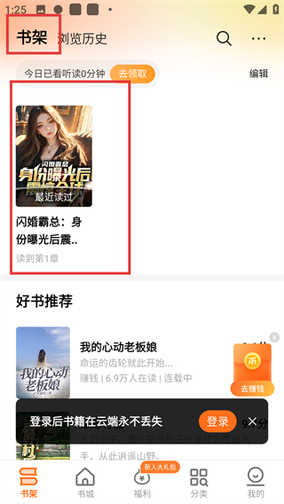 4、返回APP底部的【书架】页面,就能看到刚收藏的小说,点击即可直接进入阅读界面,续读之前的内容呀。