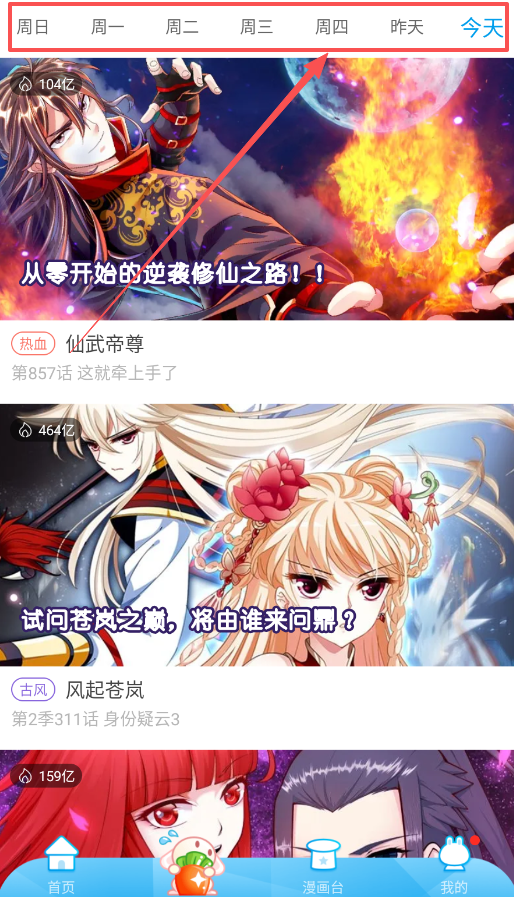 3、然后在更新页面查看每周更新时间表,这里标注了每天更新的具体漫画,点击作品封面即可开始阅读,还能看到每话的标题和人气值。