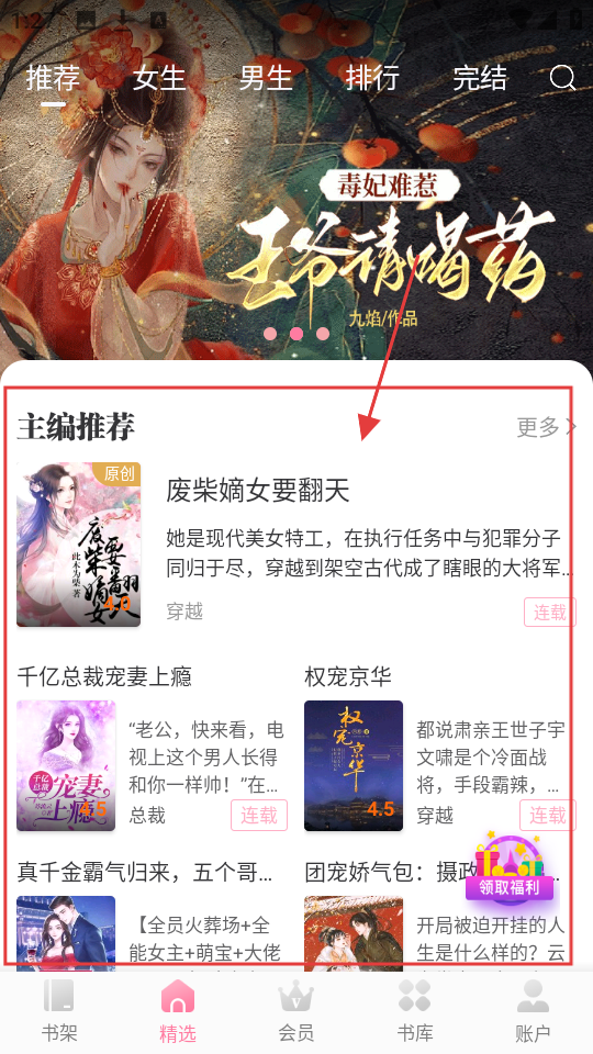1、在精选页面,可浏览主编推荐的书籍,点击感兴趣的书籍,进入书籍详情页啦。