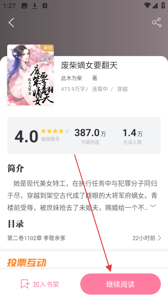 2、进入书籍详情页后,点击【继续阅读】,可进入阅读页面哦。