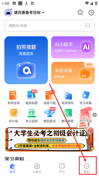 1、在APP首页,点击底部的【我的】标签,进入个人中心界面,可查看各类学习功能入口啦。