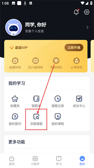 2、进入个人中心后,找到【浮窗搜题】选项并点击,进入悬浮窗搜题的设置界面,准备开启相关功能哦。