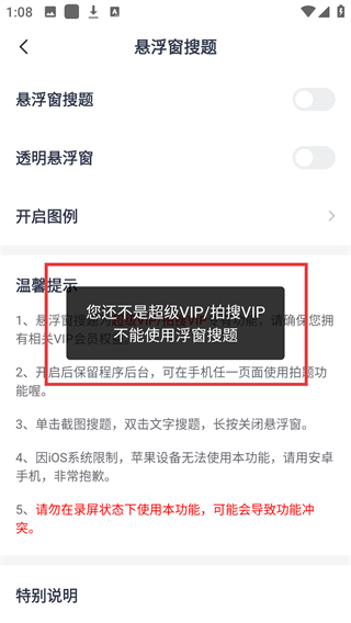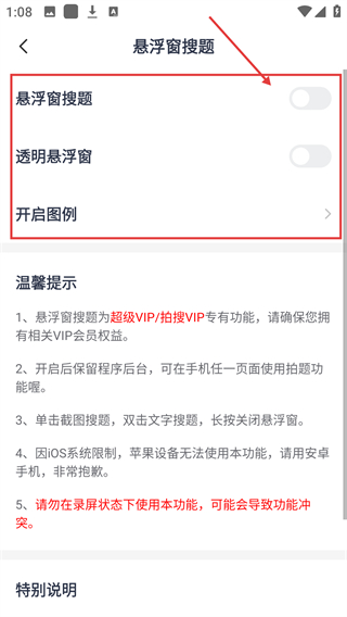 3、在悬浮窗搜题设置页,可看到功能开关与使用说明,需确认是否拥有【超级VIP/拍搜VIP】权限才能启用呀。