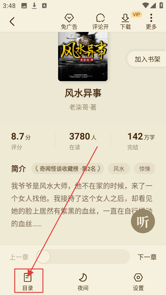 2、在小说详情页,点击底部【目录】选项,进入目录页面,可查看小说各章节列表哦。