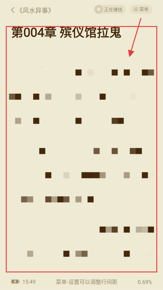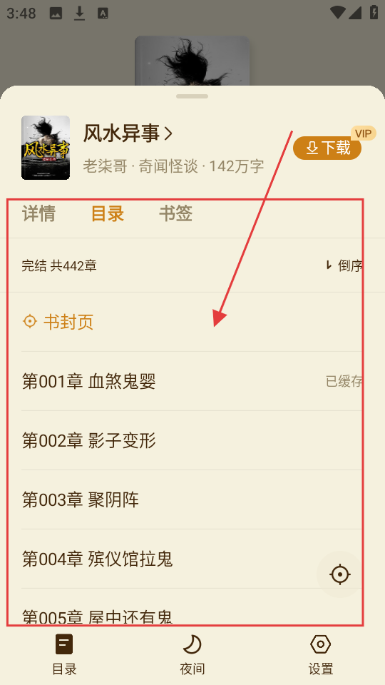 3、在目录页面,选择想要阅读的章节,比如第004章殡仪馆拉鬼,点击进入章节阅读页面呢。
