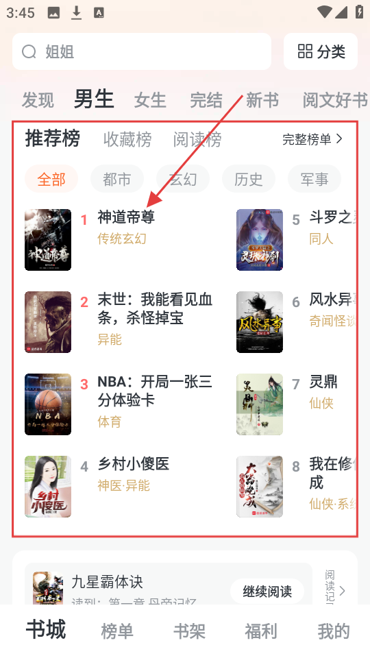 1、在榜单页面,看到推荐榜里的《神道帝尊》,点击它,就能进入书籍详情页面,查看书籍信息啦。