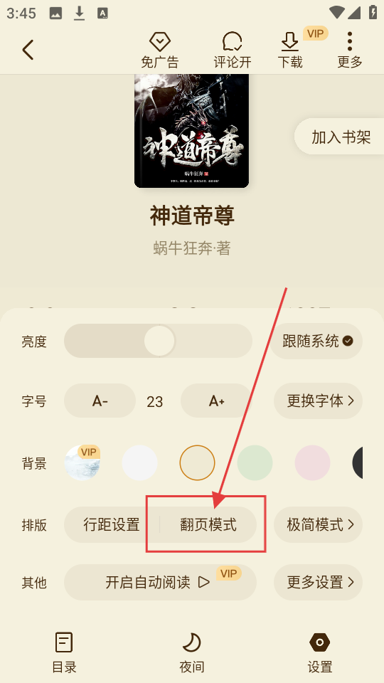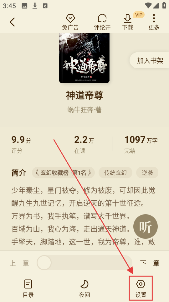 2、进入《神道帝尊》详情页,看到底部【设置】选项,点击它,就能进入阅读设置页面,调整阅读相关设置。