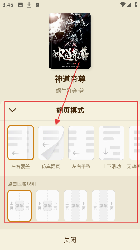 4、在翻页模式选择页面,有【左右覆盖】等多种模式,选你喜欢的,这样阅读时翻页就按你选的模式来啦。