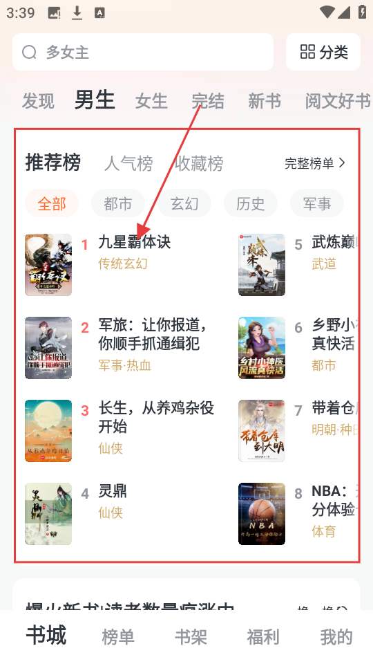 1、我们进入小说软件,若想查看推荐的小说,比如《九星霸体诀》,点击该小说,就能进入阅读页面啦。