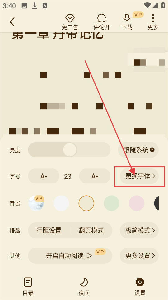 3、打开设置选项栏后,若想更换字体,点击【更换字体】,就能进入字体选择页面呢。