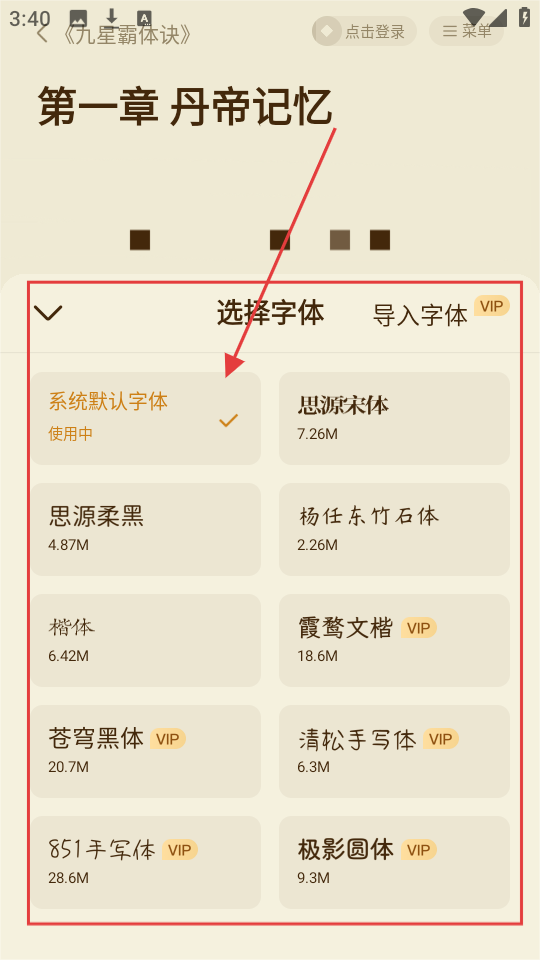 4、进入字体选择页面后,可选择喜欢的字体,如系统默认字体、思源宋体等,选择后就能应用该字体进行阅读啦。