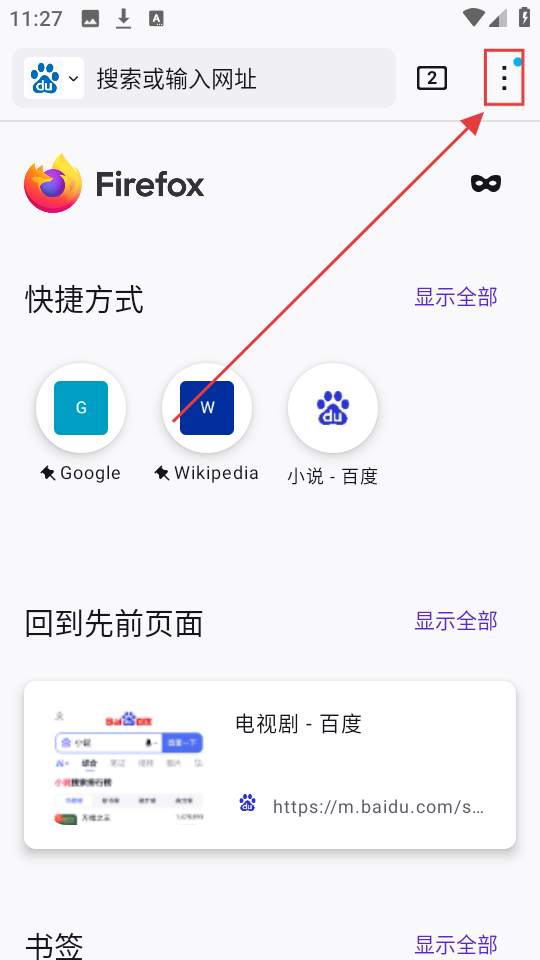 1、 首先我们进入火狐浏览器安卓版当中,然后在搜索处搜索自己的需求,这里以百度为例;