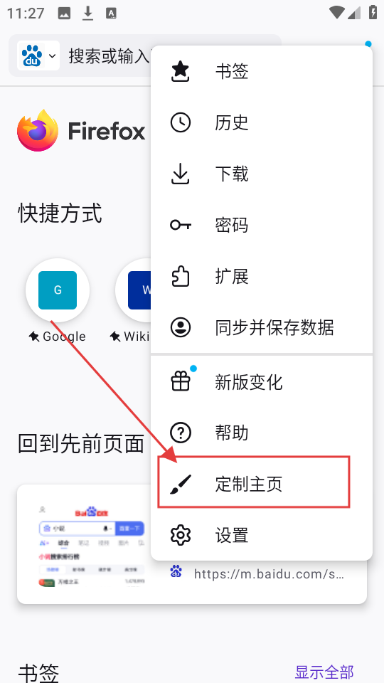 2、在展开的功能菜单里,我们点击【定制主页】,就可以进入主页定制界面,调整主页相关设置。