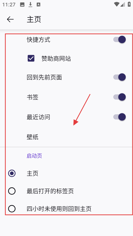3、进入主页定制界面后,我们能看到“快捷方式”“赞助商网站”“书签”等选项,可对主页元素进行设置。