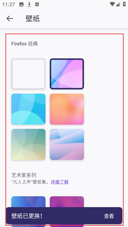 4、我们选择喜欢的壁纸,点击后,页面会显示【壁纸已更换!】,说明成功更换了浏览器壁纸。