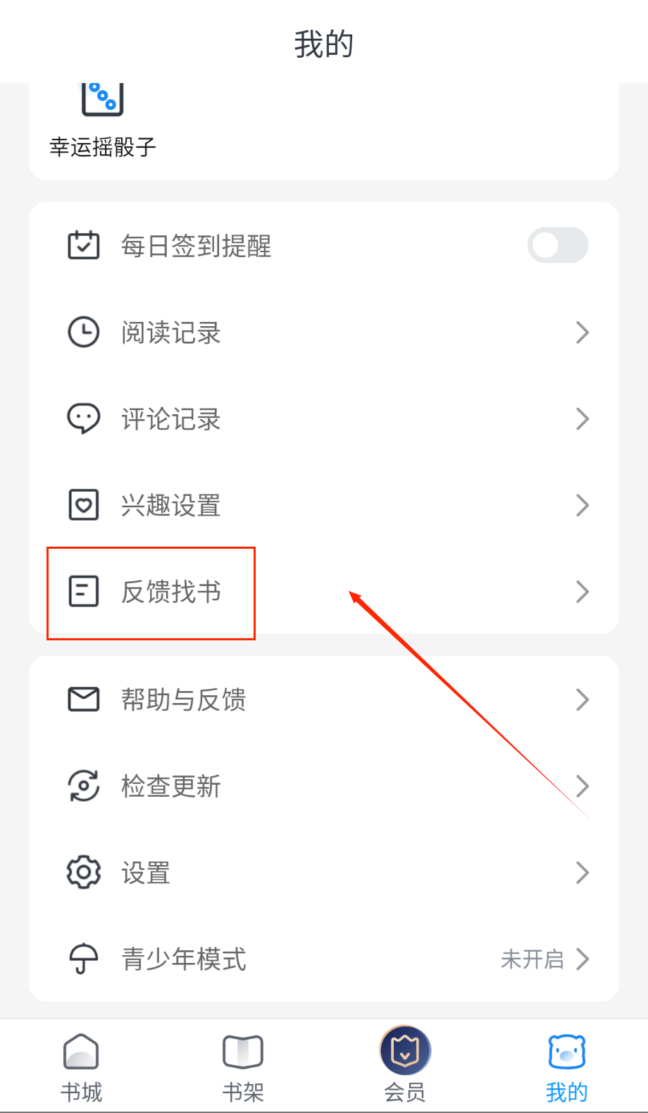 4、通过反馈找书功能可以请求书友推荐,遇到问题也可以在帮助中心寻找解决方案。