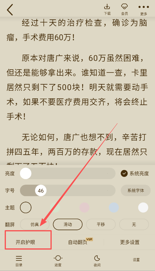 3、进入阅读界面后,你可以通过屏幕下方的菜单调节亮度和字体大小,共有46级字号可调,总能找到适合你的舒适尺寸。