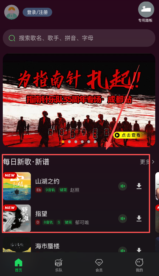 2、找歌和乐谱是核心,你既能在首页搜索框输入关键词查找,也能在“每日新歌·新谱”板块发现像郁可唯《指望》这样的最新内容。