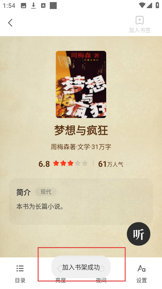 2、在小说详情页点击【+加入书架】,就能把《梦想与疯狂》添加到书架啦。