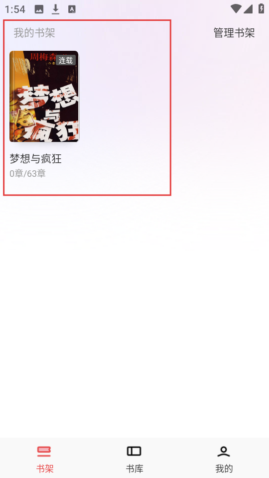 4、点击【书架】,就能看到添加的《梦想与疯狂》,快速进入阅读啦。