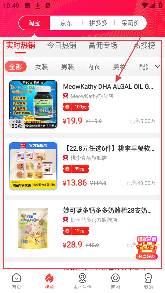 4、我们还能切换到【榜单】页面,这里有实时热销等各类商品榜单,能看到不同商品的价格、销量等信息,方便挑选商品哦。