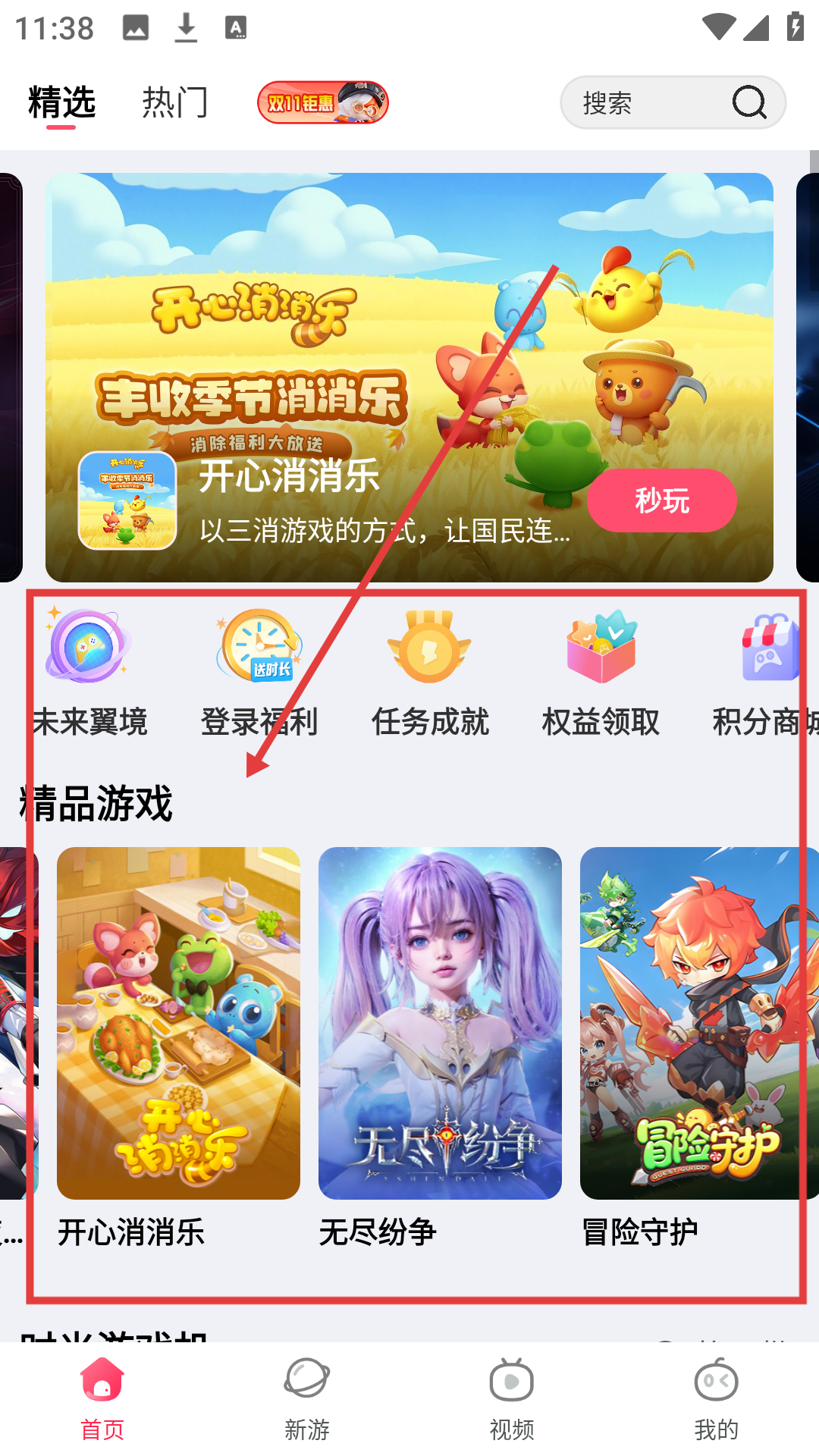 1、在APP首页,点击《开心消消乐》的推荐内容,可进入该游戏的详情页面,准备开始游戏啦。