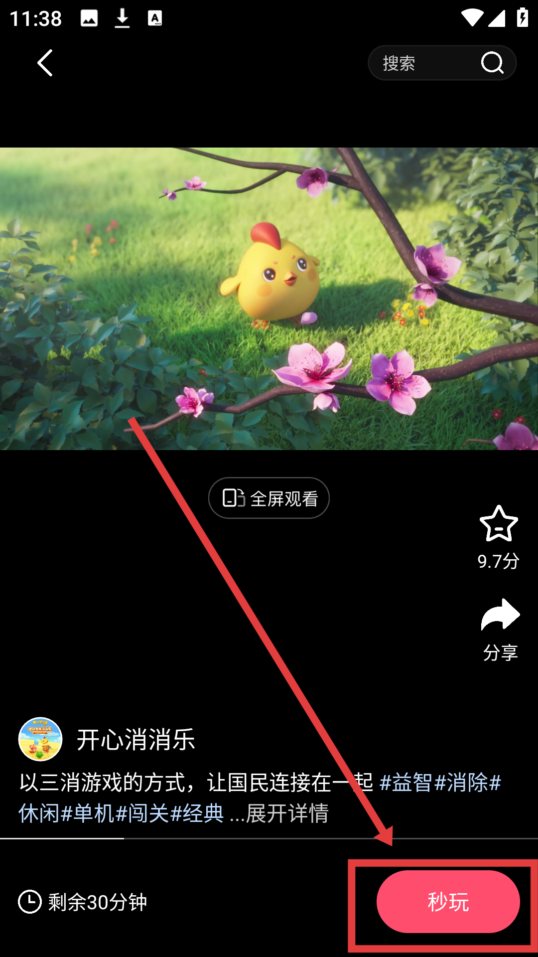 2、进入《开心消消乐》详情页面后,点击【秒玩】,可触发登录提示,准备登录游戏哦。